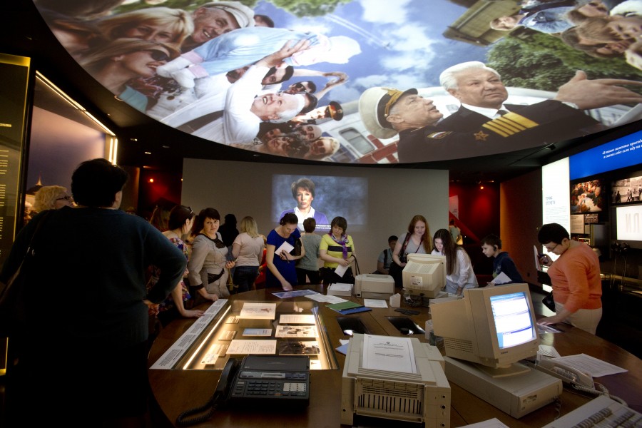 Экспозиция «В предвыборном штабе» слайд-шоу, посвященное предвыборным поездкам Бориса Ельцина, и рабочий стол избирательного штаба