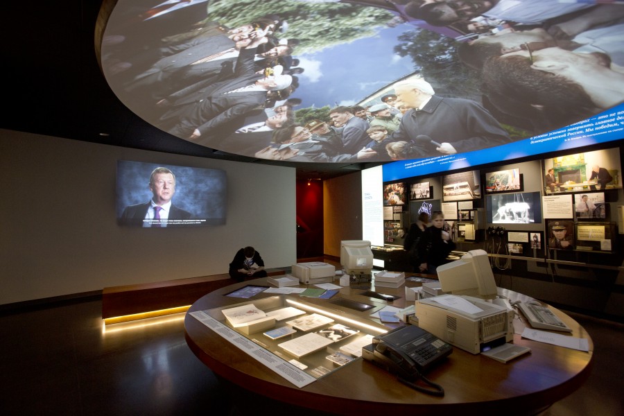 Экспозиция «В предвыборном штабе» слайд-шоу, посвященное предвыборным поездкам Бориса Ельцина, и рабочий стол избирательного штаба