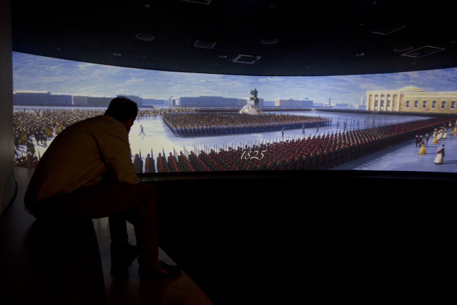 Лабирин Российской истории. Панорамный экран, на котором демонстрируется мульфильм, где с помощью компьютерной графики воссозданы переломные моменты российской истории