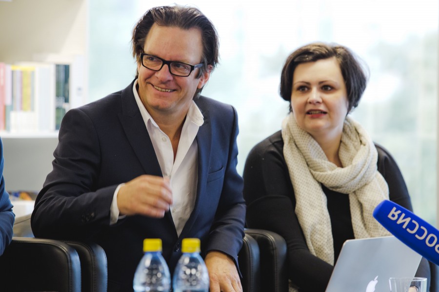 Несколькими часами ранее в книжном магазине «Пиотровский», традиционном месте проведения пресс-конференций, представители СМИ встретились с разработчиком проекта, художником по свету из Германии Штефаном Хофманном, исполнительным директором Президентского центра Б.Н. Ельцина Александром Дроздовым и главным художником Екатеринбурга Дмитрием Фогелем.