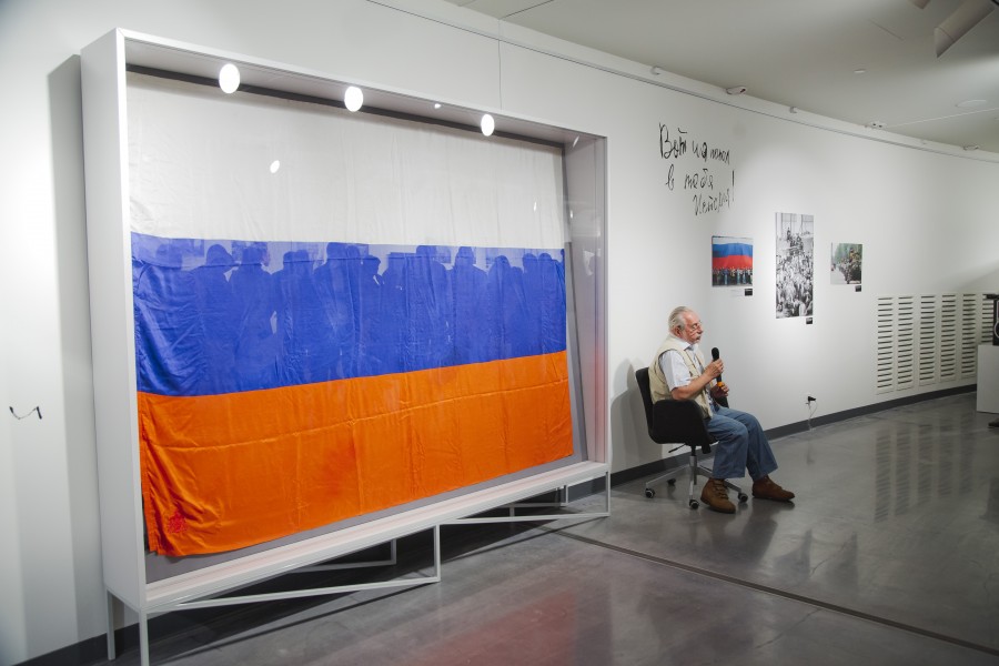 Одним из мероприятий специальной программы Ельцин Центра, посвященной 25-летию победы над ГКЧП, стала презентация уникального экспоната выставки «Август 91-го. Люди на площади» – российского триколора, который был поднят над Белым домом в Москве 22 августа 1991 года. Она состоялась в 17 часов в Арт-галерее. Виктор Ярошенко, почетный хранитель триколора, в 1991 году народный депутат СССР, рассказал историю флага.