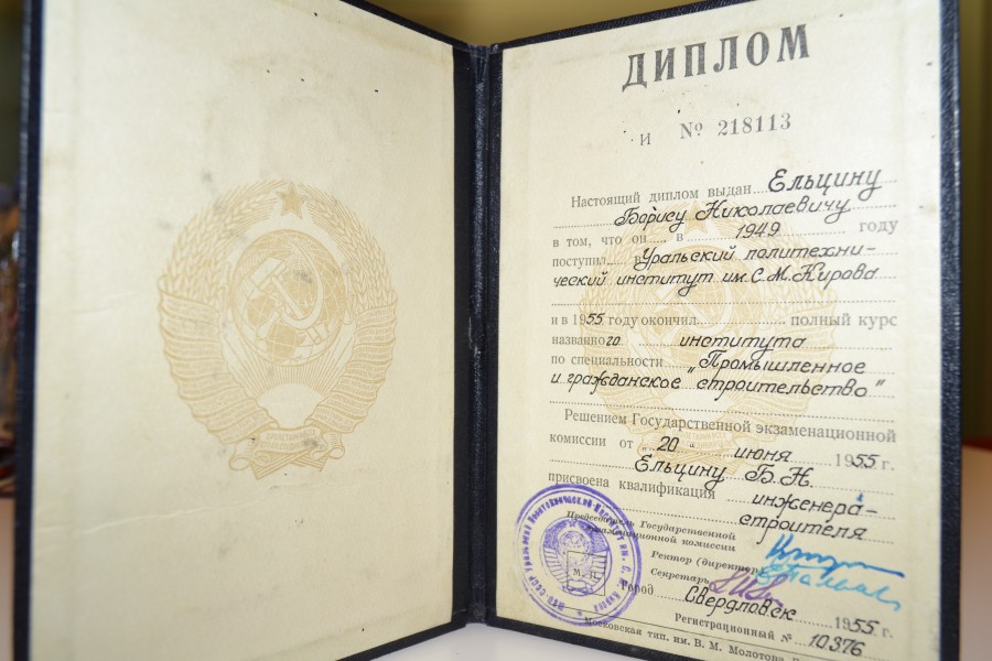 Диплом «выдан Ельцину Борису Николаевичу, в том, что он в 1949 году поступил в Уральский политехнический институт им С.М. Кирова и в 1955 году окончил полный курс названного института по специальности “Промышленное и гражданское строительство”»