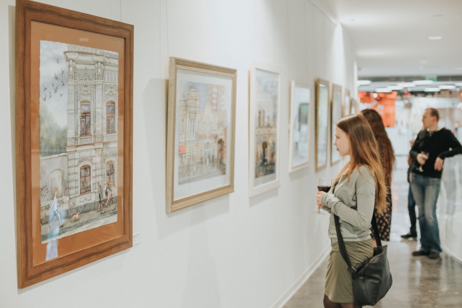 В Круглом зале Ельцин Центра 30 марта состоялось открытие персональной выставки художницы Алёны Дергилевой «Образ города. Екатеринбург. Москва. Провинция». В экспозиции представлены акварели и офорты из перечисленных в названии выставки серий, а также портреты екатеринбуржцев. Алёна – известный портретист и к рисованию домов подходит соответственно – рисует их портреты.
