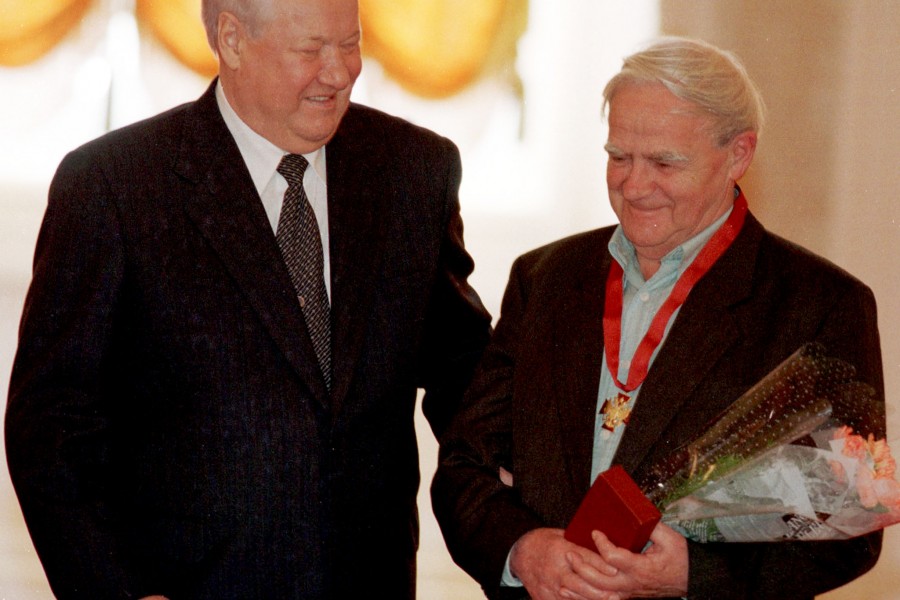 TAC27 Россия, Москва. 27 октября. Президент России Борис Ельцин вручил сегодня в Георгиевском зале Большого Кремлевского дворца государственные награды военным, инженерам и конструкторам, лидерам регионов, деятелям культуры России. На снимке (слева направо): Борис Ельцин и писатель Даниил Гранин, награжденный орденом "За заслуги перед Отечеством" 3-й степени. Фото Александра Сенцова (ИТАР-ТАСС)