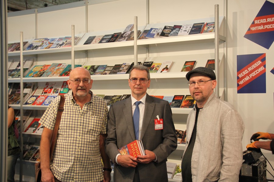 Писатель Юрий Буйда, советник-посланник посольства РФ в Испании Дмитрий Соколов, писатель Алексей Иванов