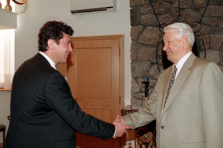 Российская Федерация,Шуйская Чупа. Находящийся здесь на отдыхе Президент России Борис Ельцин встретился 8 июля с первым вице-премьером Борисом Немцовым. На снимке:Борис Ельцин (справа) и Борис Немцов во время встречи. Фото Семена Майстермана (ИТАР-ТАСС)