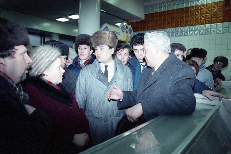 Губернатор Борис Немцов сопровождает президента РФ Бориса Ельцина во время поездки по городам Поволжья в Нижнем Новгороде (10.01.1992). Дмитрий Донской/Архив Президентского центра Б. Н. Ельцина