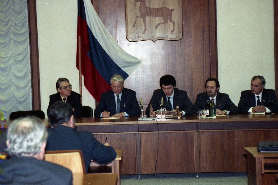Губернатор Борис Немцов сопровождает президента РФ Бориса Ельцина во время поездки по городам Поволжья в Нижнем Новгороде (10.01.1992). Дмитрий Донской/Архив Президентского центра Б. Н. Ельцина