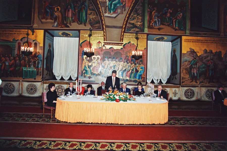 Россия. Москва. 12-14 января 1994 г. Супруга президента РФ Наина Ельцина, президент США Уилям Дж. (Билл) Клинтон, президент РФ Борис Ельцин, супруга президента США Хиллари Клинтон, председатель Правительства РФ Виктор Черномырдин. Первый официальный визит президента США Билла Клинтона в Москву. Были подписаны: Меморандум о намерениях между правительствами двух стран о сотрудничестве в области экспортного контроля и контракт на продажу в США в течение 20 лет российского урана. Принято Совместное заявление о нераспространении оружия массового поражения и средств его доставки, а также Декларация, фиксирующая договоренность об отказе РФ и США от нацеливания друг на друга стратегических ядерных ракет. Фото Дмитрий Соколов