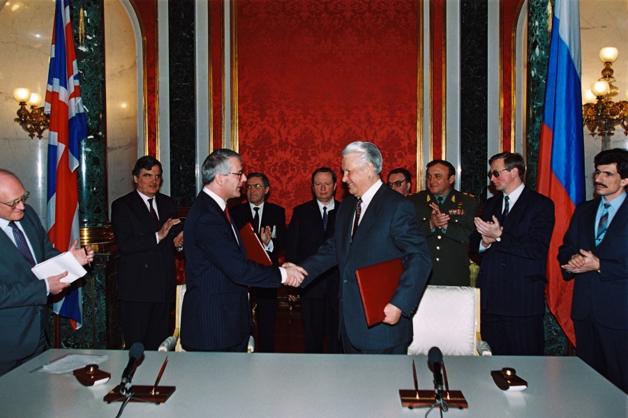 Россия. Москва. 14-16 февраля 1994 г. Президент РФ Борис Ельцин и премьер-министр Великобритании Джон Мэйджор. Были подписаны заявления о перенацеливании ядерных ракет и проведении совместных военных учений. Среди присутствующих министр обороны РФ Павел Грачев. Фото Дмитрий Соколов
