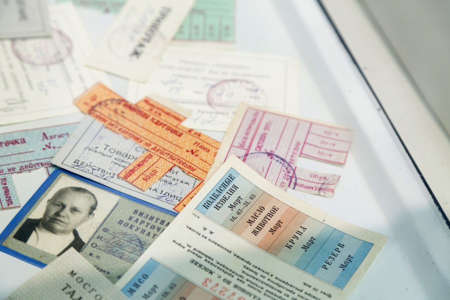 Экспозиция «Продовольственный кризис», воссоздающая обстановку продуктового магазина начала 90-х годов.