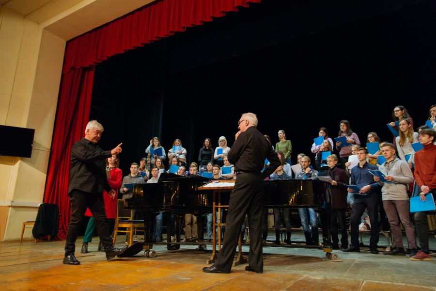 В преддверии показа театрализованной музыкальной программы «Молот и серп», который пройдет в Атриуме Ельцин Центра 1 октября, Алексей Гориболь провел репетицию с репетицию с местными артистами и дирижером, руководителем камерного хора Уральской Государственной консерватории имени Мусоргского профессором Владимиром Завадским.