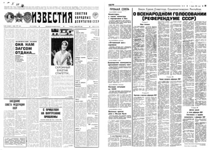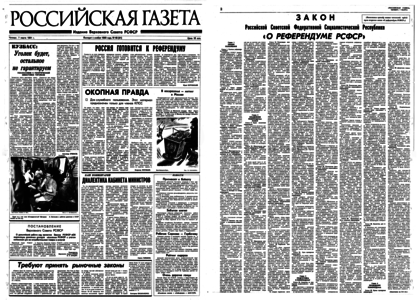 «Пресс-центр Сибирского отделения Академии наук СССР распространил обращение общего собрания отделения по поводу всесоюзного референдума 17 марта. В обращении, в частности, говорится: «Общее собрание Сибирского отделения АН СССР придает большое значение предстоящему референдуму и призывает всех ученых Сибири принять активное участие в предшествующей референдуму общественной кампании. Речь идет о судьбе нашего многонационального государства. Наш ответ на вопрос однозначен – «да»! <…>».