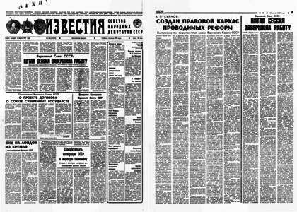 <...> …Пятая сессия Верховного Совета СССР завершила свою работу. Итоги ее подвел в своем выступлении Председатель парламента страны А. Лукьянов (выступление публикуется в сегодняшнем номере «Известий»), Впереди – парламентские каникулы и – шестая сессия Верховного Совета СССР. Первый день ее работы – 16 сентября.