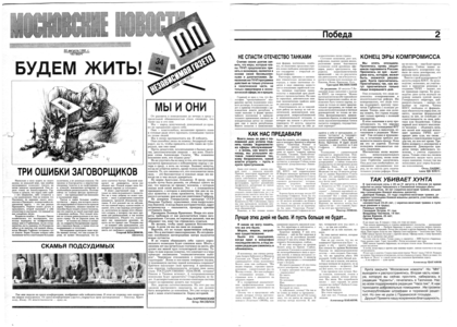 Уже вечером в среду ритм жизни города полностью восстановился. Были устранены все преграды с проезжей части гopoдских магистралей, однако заграждения и баррикады, воздвигнутые москвичами для защиты жизненно важных объектов, не будут разбираться до окончательной нормализации обстановки. Начавшаяся сессия Моссовета намерена заслушать объяснения коменданта города генерал-полковника Н. Калинина, начальника ГУВД столицы генерал-лейтенанта Н. Мырикова об их действиях и отданных распоряжениях в период чрезвычайного положения.<…>».