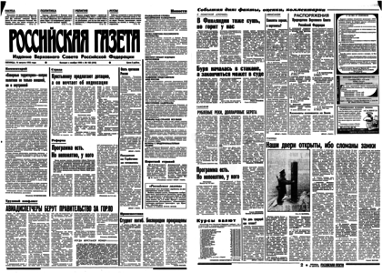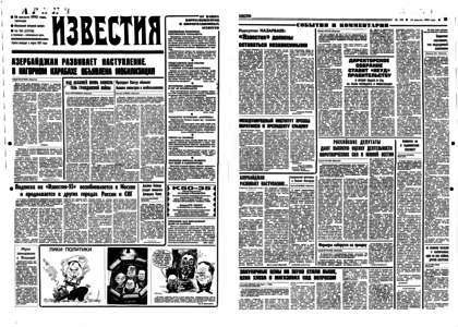 Учредитель: Журналистский коллектив «Известий» – 1992. – 14 августа, пятница. – № 184 (23758). – 8 полос.