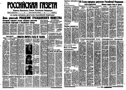«Президент и съезд народных депутатов России, говорится в заявлении, после состоявшихся сегодня утром консультаций выступили с совместным заявлением, декларировав свою «безусловную приверженность решать спорные вопросы в отношениях между законодательной и исполнительной властями исключительно конституционными методами и способами». <…>