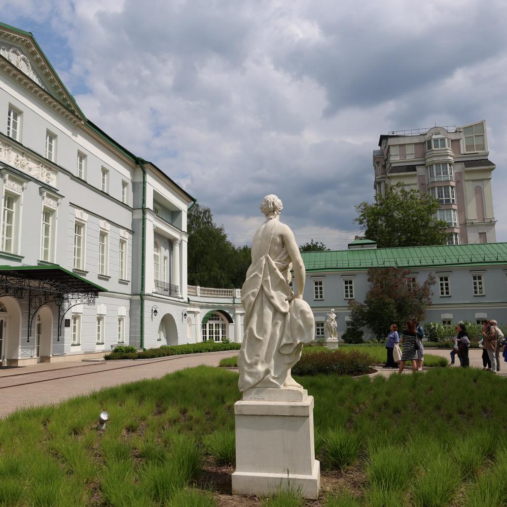 «Усадьба Долгоруковых-Бобринских: 300 лет истории» – так была определена тема экскурсии, которую провела координатор по экскурсионной деятельности московского филиала Ельцин Центра искусствовед Ирина Куликова. Началось всё с парадного (в нашем случае южного) двора, который украшают две беломраморные статуи – Елены и Париса – работы итальянских мастеров ХVIII века. Специалисты по садово-усадебной архитектуре двор перед парадным входом называют курдонёр. Курдонёр усадьбы Долгоруковых-Бобринских великолепно (скупо и точно) распланирован-ухожен и озеленён различными благородными растениями: присутствуют злаковые травы, розы, котовник, сирень, жасмин, яблоня Недзвецкого. Сразу после входных ворот растёт огромный вяз, не засыхающий, а полнокровный. Интересно, сколько ему лет? Каких людей он повидал на своём веку?